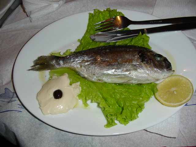 Na het voorgerecht kregen we per persoon een hele vis van zo'n 3 ons. Ik weet niet welk soort, maar het was een smaakvolle, stevige vis. Ondertussen diverse toespraken, a capella liedjes met persoonlijke gelukwensen, muziek en dans. Het laatste gerecht bestond uit een flinke kluif schapenvlees. Omdat zowel Jiska als mijn vrouw dat vlees op z'n zachtst gezegd niet echt waarderen was er voor hen varkensvlees bereid. Zelf vond ik het heerlijk, maar tot mijn spijt zat mijn maag al redelijk vol van het andere eten, dus heb ik maar een klein gedeelte van de bout op. | ||