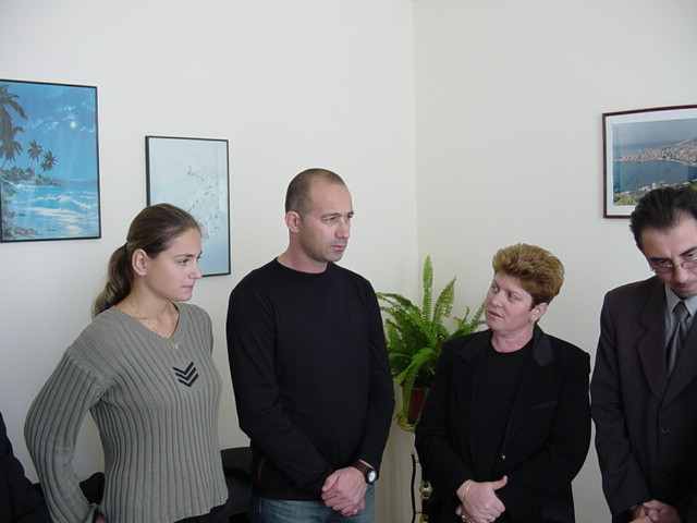 geval verplichte beëdigde tolk/vertaler, 2 ambtenaren uit het kantoortje ernaast als onafhankelijke getuigen, Tani's moeder en wij. De acte werd voorgelezen in het Albanees en Engels. Vervolgens moest het ja-woord ('po') gegeven worden en het boek worden getekend waarin alle huwelijken werden geadministreerd. Toen rees nog even een probleempje waar het kersverse echtpaar niet bij stilgestaan had. Welke achternaam wordt er aangenomen. Jiska kon haar eigen achternaam behouden, Tani kon haar achternaam aannemen of zij kon de achternaam van Tani aannemen. Na veel discussie is voor het laatste besloten. De moeder van Tani deelde nog even traditionele snoepjes uit, een soort Turks fruit met poedersuiker waardoor donkere kledingstukken van menig aanwezige een besneeuwd uiterlijk kregen. Na een goed kwartiertje stonden we weer buiten. Het was zowaar even droog, maar dat duurde niet lang. | |||