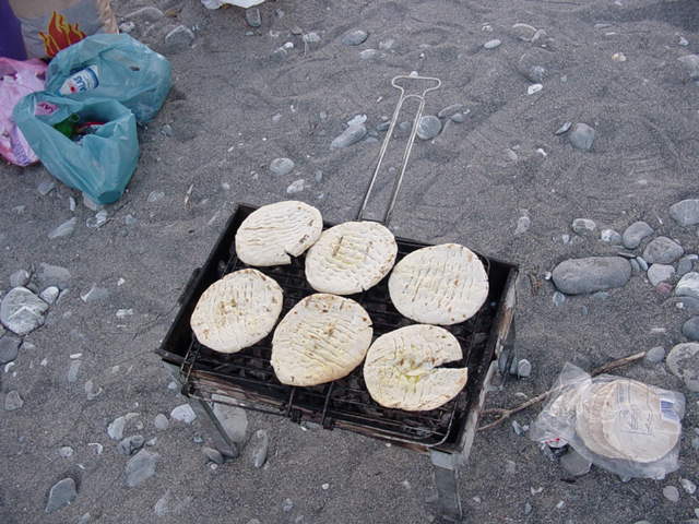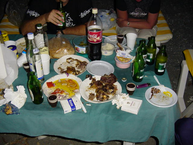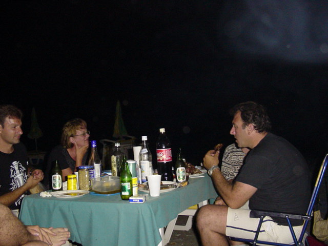 Om 18.30 kwamen we aan op een vrijwel verlaten stuk strand, vlakbij Oceanis. Uit de auto’s werd een grote hoeveel spullen geladen om de bbq-plaats gestalte te geven: een tafel, stoeltjes, een grote hoeveelheid plastic zakken met allerlei etenswaren en andere zaken die voor een bbq nodig zijn; alleen was men vergeten een flesopener, een kurkentrekker en een aansteker mee te nemen. Gelukkig hadden wij deze laatste bij ons, anders hadden we rauw vlees moeten eten en een aansteker werkt ook prima als opener. Er was uiteraard ook voor voldoende drank gezorgd: bier, zelfgemaakt bier, ouzo en tsipouro. Wij hadden enkele flessen wijn meegenomen, maar die konden helaas niet ontkurkt worden.