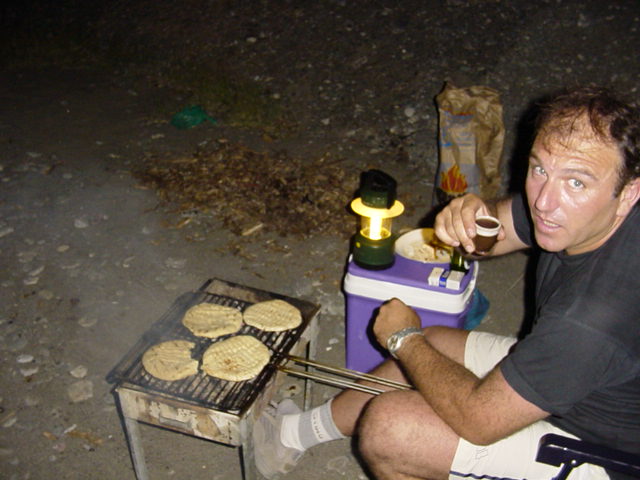 Er was ook een koelbox en een grote zak ijsklontjes. Wat ging er in de koelbox? Juist, het bier; het vlees werd er gewoon naast gelegd en dat in een temperatuur van nog ruim 25 graden.